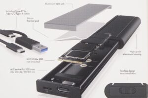 Алюминиевый корпус для твердотельного накопителя USB 3.2 NVMe со скоростью до 10 Гбит/с. В комплект также входят адаптер USB-A/USB-C, кабель USB-C, 2 термопрокладки и радиатор. Подходит для SSD-накопителей 22×30, 22×42, 22×60 и 22×80. Не подходит для твердотельных накопителей типа SATA. При добавлении и замене диска не требуются дополнительные инструменты. На коробке также имеется переключатель для защиты от записи.
